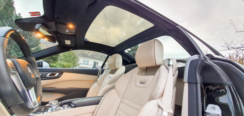 Il s'agit de mon premier coupé-cabriolet, et grâce au toit vitré (et électro-chromatique) l'habitacle est baigné de lumière. Par rapport aux capotes en toile, ça fait nettement moins grotte (cf photo ci-dessous). A noter que le poids est relativement contenu, étant annoncé à 1770kg DIN (1845kg CE).