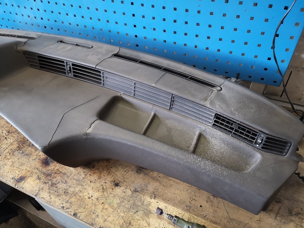 Tableau de bord d'origine. Ils sont tous comme ça... Alors avec mon pote Nathanaël de Nm-Technic on l'a floqué (ponçage, mastic, flocage).