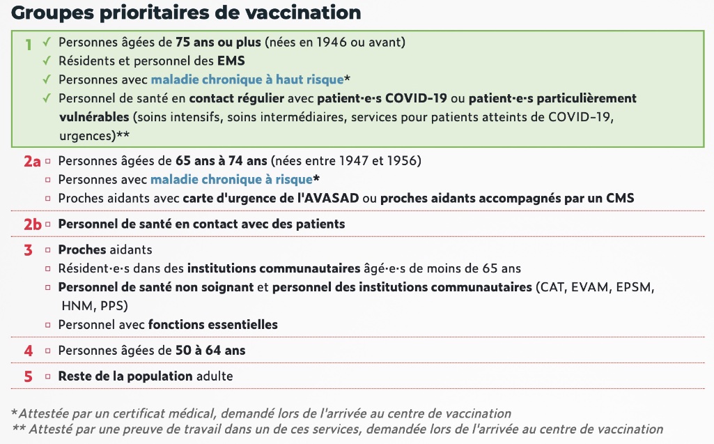 Partant de ce principe, si vous faites partie du groupe 1, vous serez traité en priorité (en fonction des stocks disponibles, bien évidement) même si la vaccination s'ouvre aux autres groupes. Les conditions sont strictes et surtout objectives. Donc si vous avez 60 ans sans pathologie, vous serez dans le groupe 4. Si votre maladie chronique est considérée à risque vous êtes dans le groupe 2. Le groupe de maladies chroniques a très hauts risques est extrêmement limités et c'est donc normal que peu de monde y soit inclus.