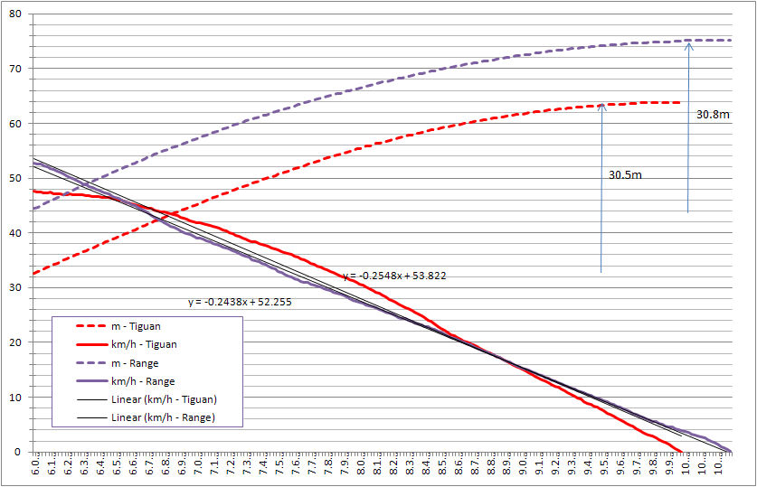 Malheureusement je n'ai pas reussi a atteindre exactement la meme vitesse avec les 2, le Range a pres de 5 km/h de plus, et il freine seulement 30 cm plus long, ce qui n'est pas significatif... donc, ca se confirme, meme a 50 km/h un Range freine mieux. On voit que le Range produit un deceleration bien reguliere pendant tout le freinage, ce qui est loin d'etre le cas du Tiguan (a noter que j'ai un defaut d'ESP sur le Tiguan, mais je doute que ca compte au freinage en ligne droite).