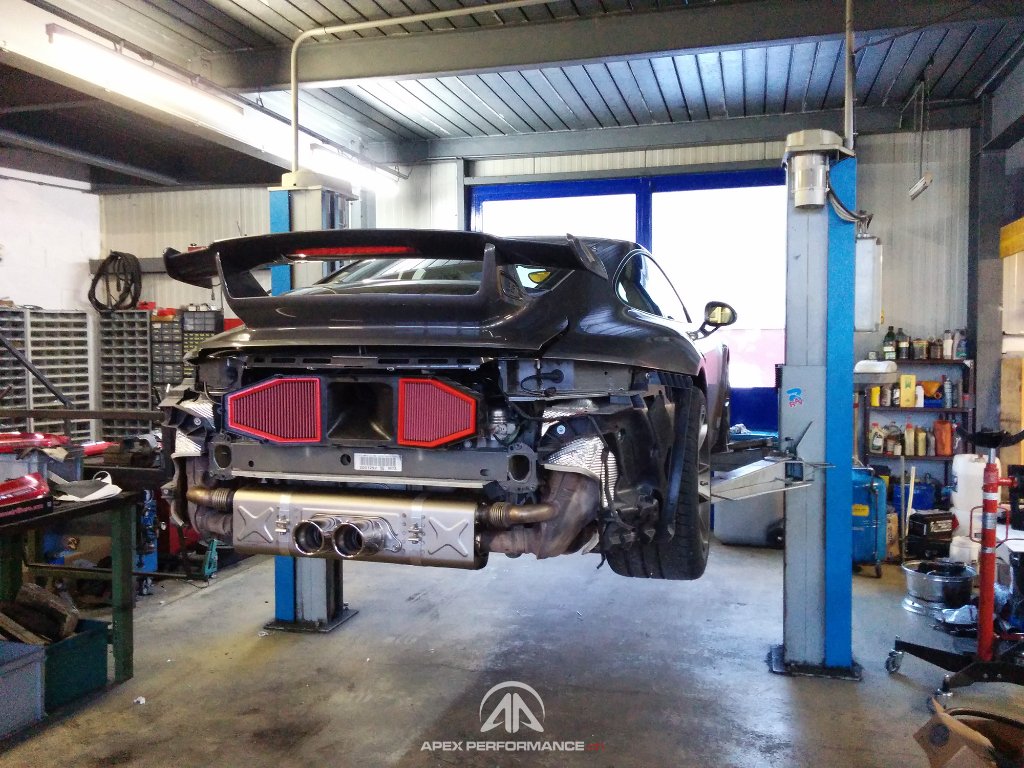 Projet sur cette Porsche 991 GT3 Phase 1 de 2015 avec pack ClubSport. Installation d'un silencieux Akrapovic Slip-On titane, filtre à air BMC et disques Brembo Racing Type III. Reprogrammation à 504cv et 475nm
