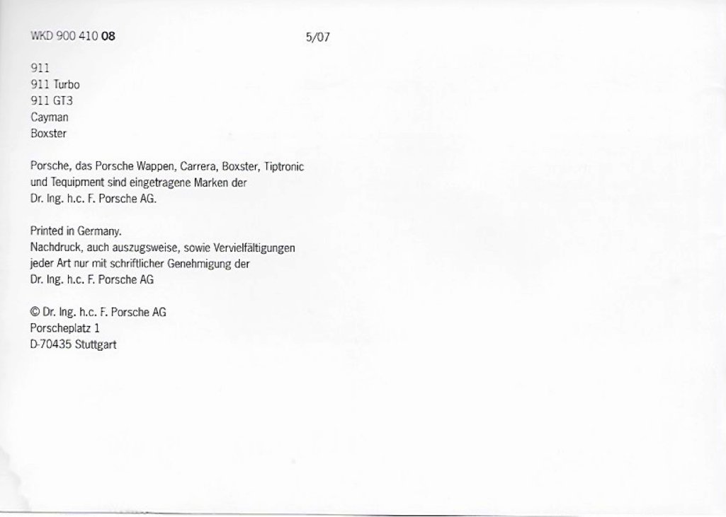 Je viens vers vous car je cherche une traduction de mon manuel d'entretien qui est en allemand. Cela concerne ma Porsche 997 Cs de 2008. Le mien concerne les modèles incluant les "Cayman" jusqu'en 2008, annoté "5/07". Je poste un fichier pdf des 2 premières pages de celui en ma possession. Si l'une ou l'un d'entre vous aviez une traduction en français, ou un lien avec des photos de la première moitié, ce serait génial. Tous les autres documents m'ont été donné en fr sauf celui-là. Merci d'avance.
