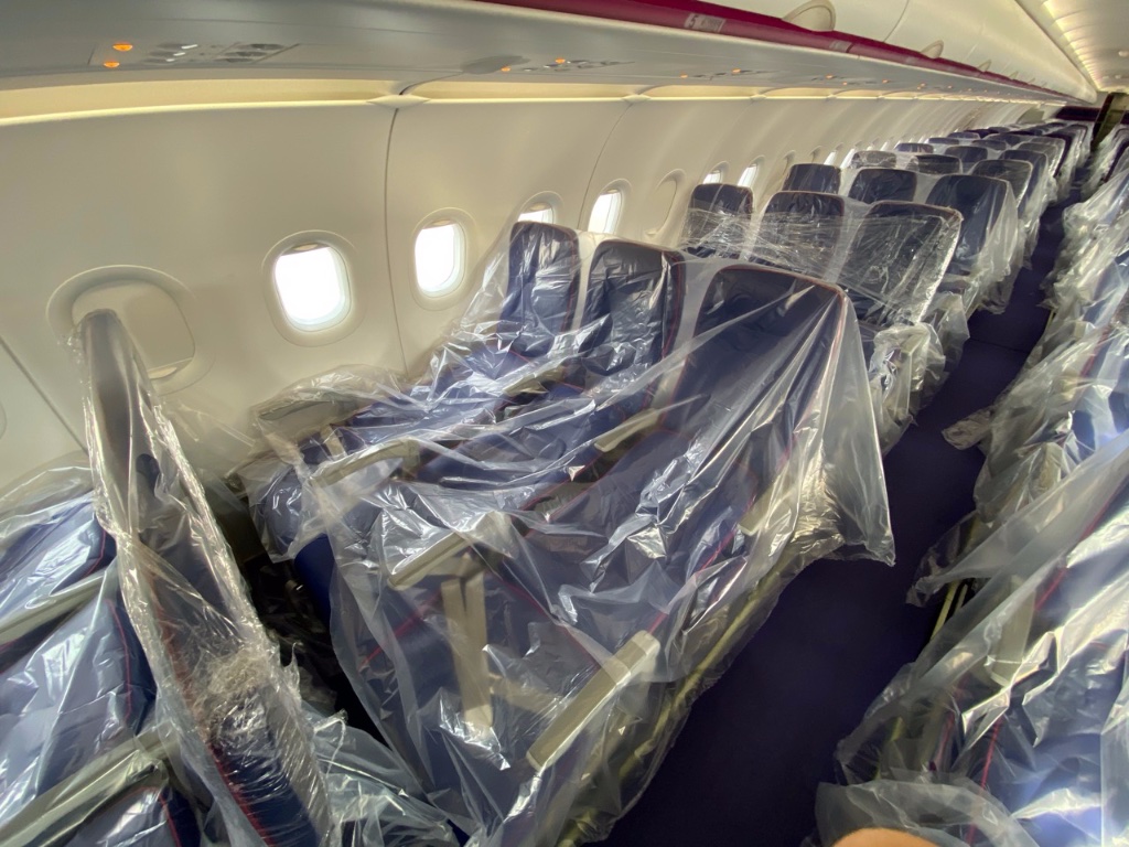 On arrive ensuite à l'avion, plusieurs mécanos sont encore en train de l'inspecter centimètre par centimètre à la lampe de poche en plein jour, ils nous disent qu'on leur a demandé de vraiment faire en sorte que tout soit parfait, merci encore à eux. Tous les niveaux étaient exactement comme décrits dans le manuel de vol, jamais vu ça avant, c'était toujours dans l'enveloppe, mais jamais identique des deux côtés car économiquement pas viable de refaire les niveaux tant qu'ils sont OK. On trouve une cabine un peu particulière, une rangée sur deux est couchée pour pouvoir mettre les boites, les dossiers font office de support horizontal pour limiter les mouvements.