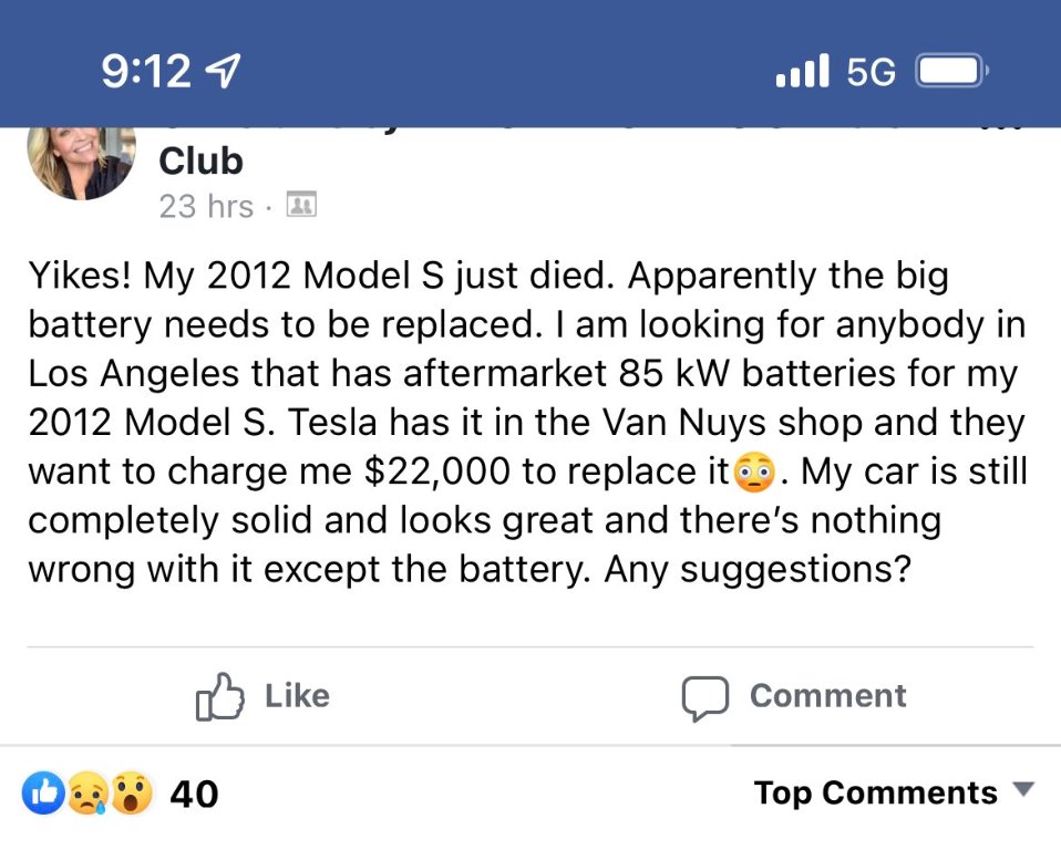 Donc oui, c'est bien un problème, mais un problème de toute caisse qui vaut cher à l'achat et qui a décoté. Je ne veux pas savoir combien me coutera de changer un des 3 turbos de mon X5 le jour où il se mettra à pécloter... Ce sera du même ordre = j'aurai une caisse à 25 kCHF et une facture à 8k sur le bureau. Celui qui m'achèterait mon X5 serait la même situation que le proprio de tesla qui doit changer un pack = il a pas les moyens de se payer une super caisse neuve, il l'achète avec mega décote. Mais cette décote, c'est une prime de risque car il roule dans une caisse à 140 pour 25 k en échange de l'acceptation du risque. Si ca se passe bien, super bon plan. Si ca merdoie, ben faut assumer quand on spiele.