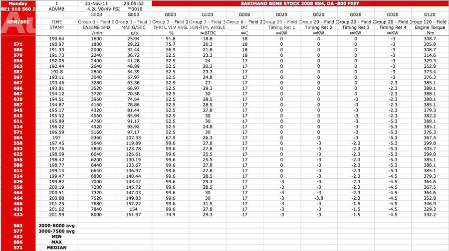 Niko.996 a écrit :Voici un log d'une RS4 B7 pas mal en forme et d'origine on voit bien la bride sur le papillion... de se faite d'origine non remapée... d'après ces chiffres MichelD arrive par son expérience à estimé la puissance... sachant qu'une B7 en bonne santé passe 160g/s sur MAF... tout ces chiffres donnes une multitude d'information exemple le type d'essence utilisée... sur la photo il n'y a pas toutes les informations...