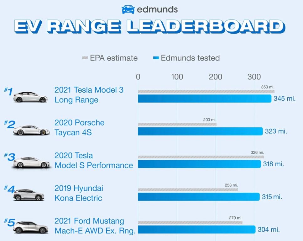 On voit que les 5 meilleures voitures testées se tiennent dans une fourchette du Model S (#3) +10/-5%, alors que la fourchette de valeurs EPA par rapport à la Mach E (#3) est de +30/-25%.