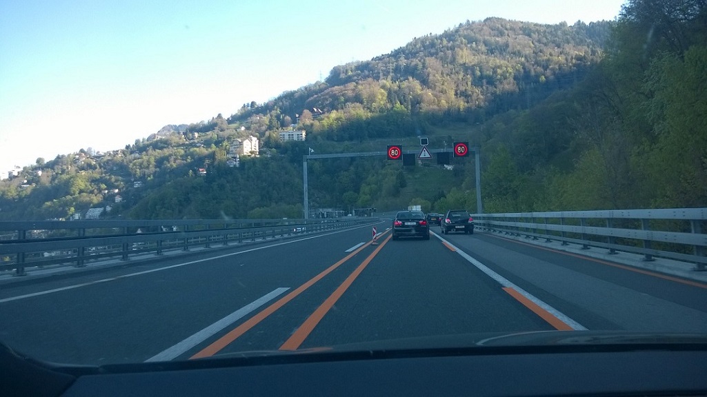 Par rapport aux limitations de vitesse, ce matin c'était encore 80km/h, je ne sais pas quand le passage à 60 sera fait, mais soyez prudent à suivre les panneaux! Des panneaux indiquant la fluidité du traffic ont été installés autour de l'ouvrage, mais malheureusement après la sortie d'autoroute, trop tard pour prendre un chemin alternatif.