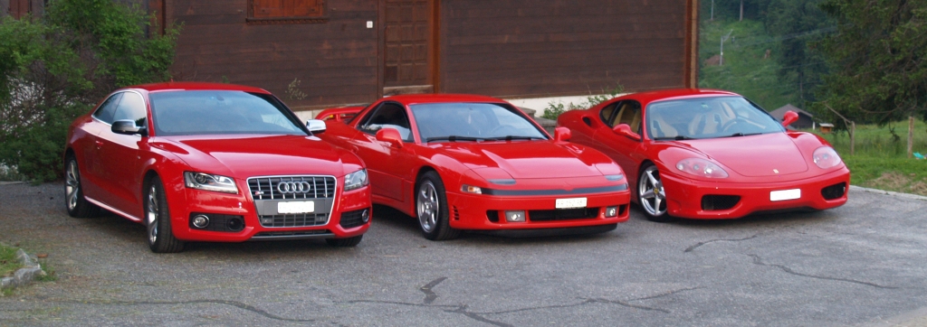D’abord au niveau purement visuel, la 3000gt exhibe les gimmicks de l’époque (pop-up et aileron). La hiérarchie dans la hauteur est respectée, la plus basse la 360, la plus haute l’Audi. En fait la S5 ressemble presque à un monospace à coté des autres… La mitsu fait de l’effet c’est sur, autant avec la S5 (même rouge) on passe inaperçu (sauf des aficionados de la marque), autant la 3000gt en jette (je connais bien des gens qui pensait que c’était une Ferrari). La F360 pour moi est parfaite, large, agressive, c’est la plus belle, mais l’arrière de la 3000gt parait presque plus équilibré (grâce à l’aileron). Les entrées d’air au niveau de la roue arrière sont factices sur la 3000GT, c’est dommage, compare a la F360 ou les entrées d’air sont toutes fonctionnelles. La teutonne se passe de toutes ces entrées et autres appendices, elle pas la pour déconner, elle.