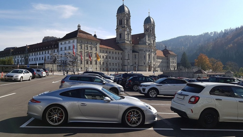 Météo radieuse qui nous a permis de manger sur une terrasse face à l'abbaye d'Einsideln - superbe complexe construit en bordure de forêt avec la ville à ses pieds.