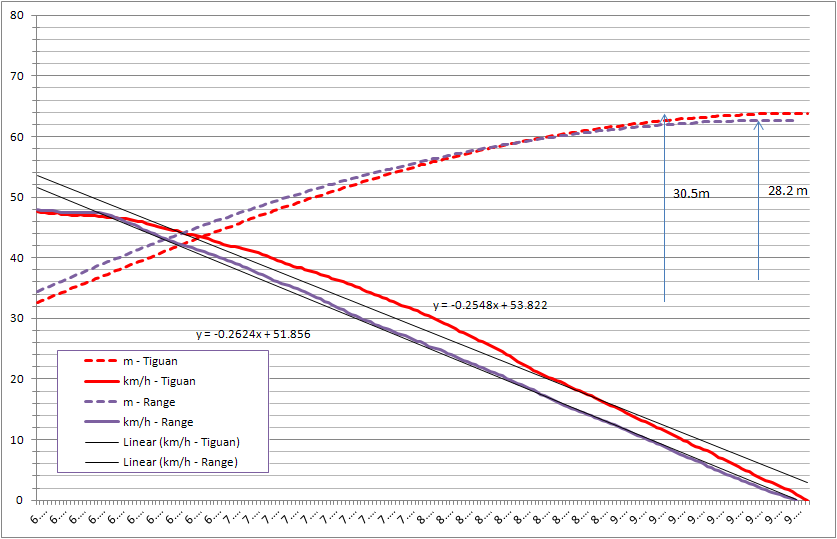 Malheureusement je n'ai pas reussi a atteindre exactement la meme vitesse avec les 2, le Range a pres de 5 km/h de plus, et il freine seulement 30 cm plus long, ce qui n'est pas significatif... donc, ca se confirme, meme a 50 km/h un Range freine mieux. On voit que le Range produit un deceleration bien reguliere pendant tout le freinage, ce qui est loin d'etre le cas du Tiguan (a noter que j'ai un defaut d'ESP sur le Tiguan, mais je doute que ca compte au freinage en ligne droite).