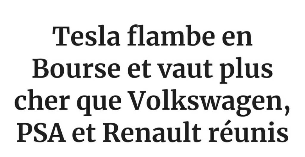 Le nice pay day pour l'ami Elon c'est peut-être pour dans 6 mois !Tom63 a écrit : ↑23 janv. 2020 16:35En attendant, Tesla dépasse les 100 milliards de capitalisation et passe juste derrière Toyota, devant VW...