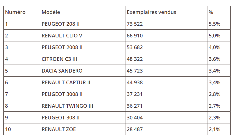 En France, les marques françaises font 10/10. La Clio détrônée par la 208 et pas de trace de la Golf.