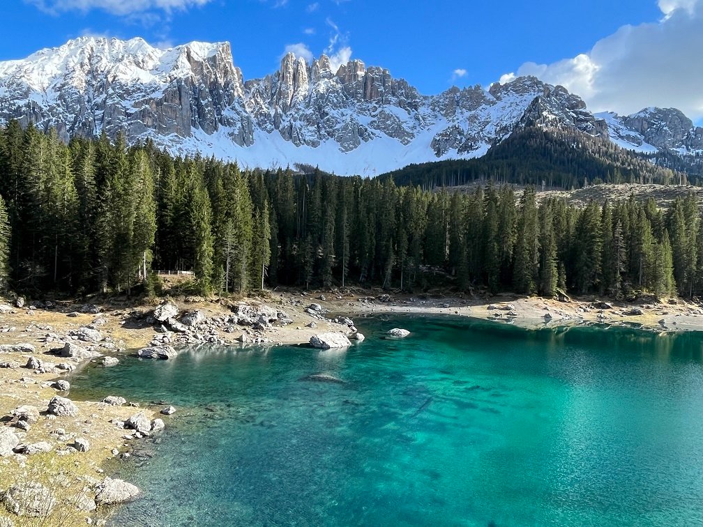 Une fois en haut on rejoint une route plus étroite qui draine le trafic des locaux qui savent que la route d'en bas est fermée, et c'est tous des Michele en puissance…Y roulent à donf avec des chars improbables, passablement au milieu de la chaussée - donc c'est une sorte de Mario Kart pour arriver vivant à Nova Levante. On y arrive en vie, et comme il y a encore un brin de soleil - on monte directement jusqu'au lac de Carezza, porte d'entrée et haut lieu du tourisme des Dolomites.