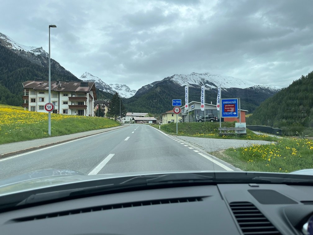 Finalement on arrive à Sluderno, j'aurai bien poussé encore 20 bornes pour voir le lago di Resia avec son clocher immergé (Curon Ventosa). On avait pas trop fait d'avance et la météo s'obscurcissait au nord, donc on traverse le charmant village fortifié de Glorenza, laborieuse la circulation au centre. Faut dire que Madame n'avait pas capté la possibilité de passer par la SP50, ayant eu tellement peur que je lui impose le Stelvio- fermé pour l'occasion. Nous voilà donc de retour en Suisse par le val Mustair - j'y étais allé jusqu'à Santa-Maria pour monter l'Umbrail et le Stelvio avec l'Elise. Des beaux souvenirs, je me prend à rêver d'une montée éclair à l'Umbrail, mais c'est CHIUSO, donc pas pour cette fois - dommage. On s'arrête quand même à Santa Maria pour un bio-stop lunch dans l'établissement en face du Garage Umbrail Tankstelle, mythique ce nom.