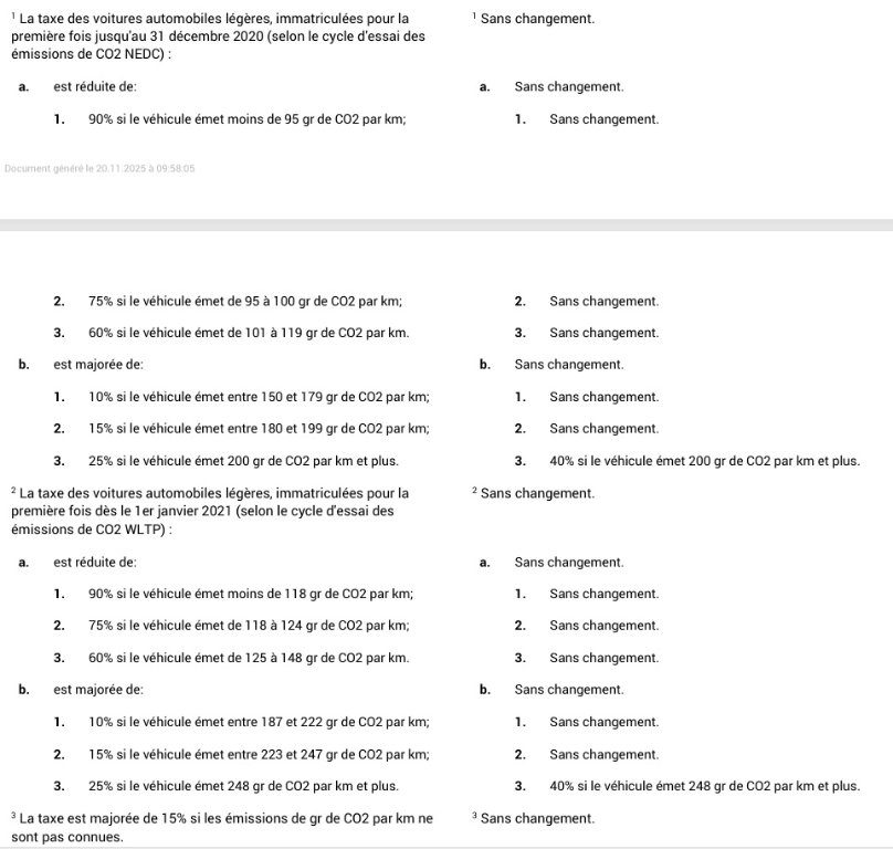 Il s'agit bien de 200gr/km de co2 pour les véhicules immatriculés jusqu'au 31 décembre 2020. Les 250gr/km sont pour les véhicules immatriculés après cette date.your momo a écrit : ↑22 nov. 2025 00:37Pas sûr qu’il faille ériger une barricade de pavés, il me semble que cette majoration concerne uniquement les véhicules avec 248gr et plus de CO2/km. Voici ce que je lis dans l’article du Blick à défaut d’une info plus officielle fournie par nos édiles si promptes à nous materner: