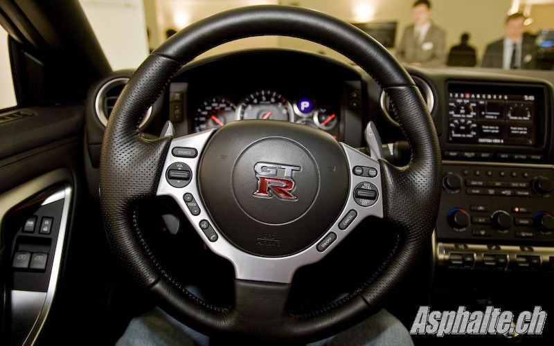 a Nissan GTR, digne décédente de la gamme Skyline peu connue en Europe, fait beaucoup parler d’elle. Fidèle à une recette éprouvée, Nissan a construit la GTR sur une plateforme techniquement très évoluée, un concentré de technologie dont le résultat fait baver les amateurs. Sous le capot, un V6 biturbo développant 480 chevaux à 6400 t/min pour un couple maxi de 588 Nm de 3200 à 5200 t/min. La boîte à double embrayage avec palettes au volant permet des changements de rapport éclairs, et la transmission se fait aux quatres roues. La configuration est transaxle (moteur avant, boîte arrière), ce qui nécessite un arbre de renvoi de couple vers le train avant. Seule ombre au tableau et tribut de cette débauche technologique, un poids à vide de 1740 kg. La GT-R sera disponible sur le marché Suisse au printemps 2009. Lors de la conférence de presse, l’ Executive Vice President, Mr Carlos Tavares, a annoncé un prix de 74’990 Euros (118’400 CHF au cours du jour).