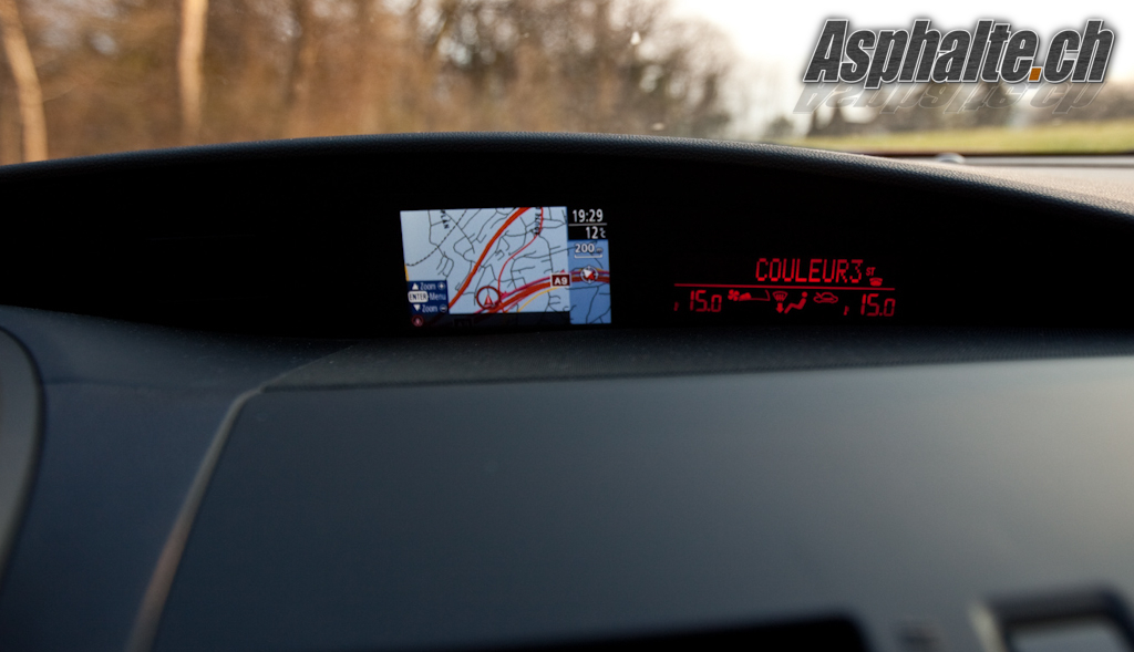 Pour étayer un peu cette affirmation, il faut parler du nouvel écran de navigation qui se trouve à la base du pare-brise (au plus loin du conducteur) et qui mesure 4.2 pouces ! L’ancien mesurait 6.5 pouces, cherchez l’erreur. Je ne pense pas me tromper en affirmant que c’est le plus petit écran de navigation commercialisé en 2010. Mais il y a pire car quand on l’utilise de nuit, l’orientation de la planche de bord ainsi que les matériaux utilisés reflètent l’écran dans le pare-brise ! Ce qui est pour le moins ennuyeux… pour ne pas dire agaçant. De plus, avec une telle taille et vu la distance, lire les informations alors qu’on conduit est une tâche délicate. La navigation ainsi que l’écran font partie du paquet « Techno » (CHF 1’900.-) qui inclut une sonorisation Bose à 10 haut-parleurs très performante. Au prix du LCD, dommage de ne pas avoir opté pour un écran avec 2 pouces de plus !