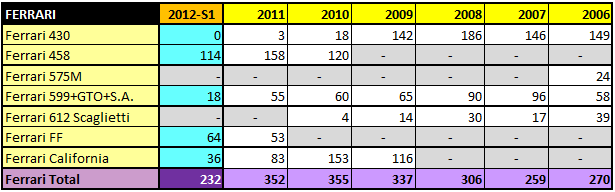 Pour Ferrari Suisse, 2012 sera un grand millésime: 232 voitures en 6 mois, des ventes de 458 Italia renforcées par la version Spider, et une FF qui fait plus que compenser la petite forme de la California.