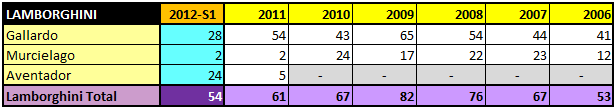Le marché helvétique est réputé pour sa forte concentration de GTs et Supercar, et 2012 ne fera pas exception. L’Aventador égale sur le premier semestre le pic de ventes annuelles atteint par la Murcielago, soit un doublement des livraisons en base annuelle, ce pour une auto dont les tarifs débutent à 433’000 CHF ! La Gallardo demeure inoxydable, maintenant un niveau de vente plus que respectable dans sa neuvième année de production !