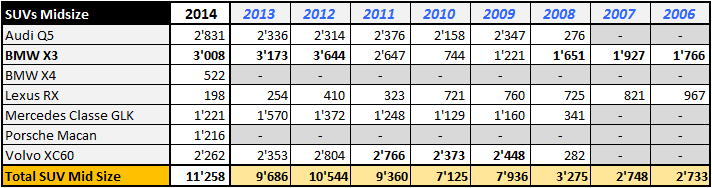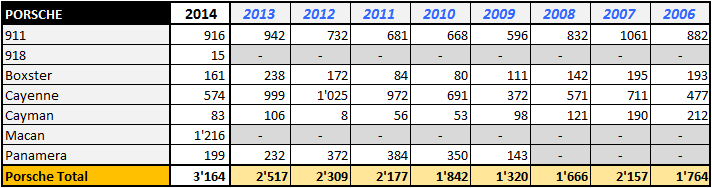 Chez Porsche, 2014 est l’année Macan : 1216 unités en neuf mois de livraisons représentent un démarrage fulgurant pour le modèle et permet au constructeur d’afficher une croissance de 25.7%.. Les volumes de Cayenne ont significativement fléchi, 2015 montrera quelle part était lié au facelift de milieu de cycle, et si il y a un effet de cannibalisation au sein de la gamme.