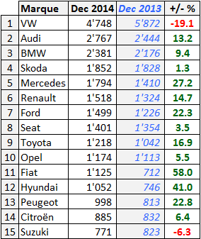 Grâce à un mois de Décembre 2014 explosif avec une progression de +9.1% des immatriculations de véhicules neufs, le marché suisse termine l’année sur une contraction réduite à -1.9%. Ce résultat est favorable si l’on considère que, hormis Décembre et Juillet, tous les autres mois furent dans le rouge, avec un minimum à -8.1% en Mars. La part des véhicules diesel continue sa stagnation à 37.0% alors que la croissance météorique des transmissions 4×4 poursuit son ascension avec 38.5% des nouvelles immatriculations. Il est difficile de déterminer si la baisse des prix du carburant a eu un effet bénéfique sur les commandes, et avec le retard inhérent aux délais de livraison, sur les immatriculations de fin d’année.