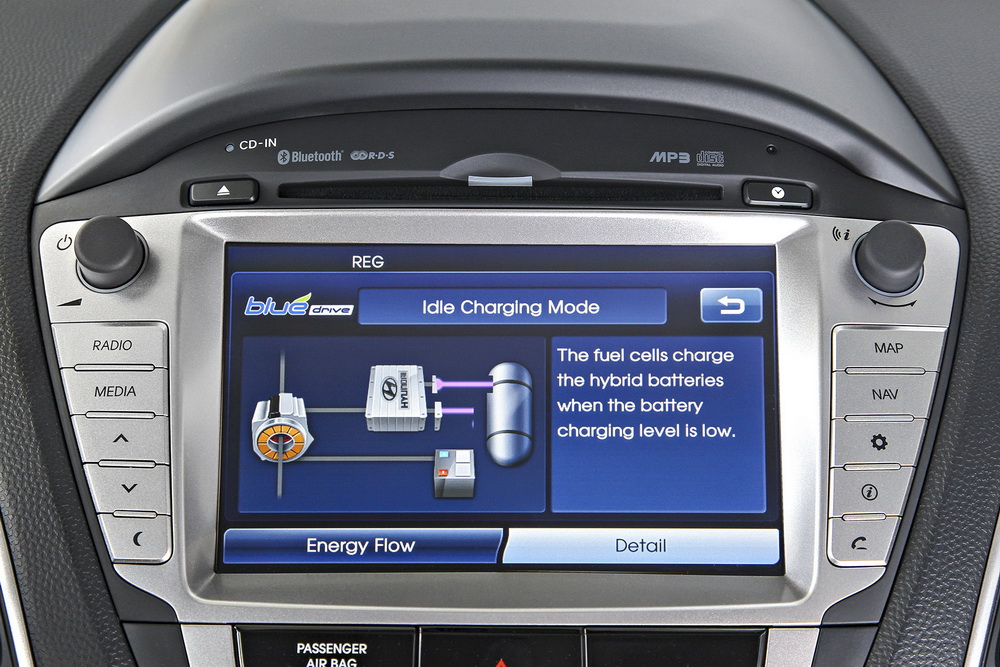 Le principe de fonctionnement est le suivant. La recombinaison de l’hydrogène contenu dans le réservoir avec l’oxygène dans l’air ambiant dans la pile à combustible produit un courant électrique. Celui-ci est utilisé pour recharger le pack de batteries Lithium Polymère de 24 kWh et/ou alimenter un moteur électrique. La batterie est également utilisée comme accumulateur d’énergie en descente ou au freinage. L’ix35 Fuel Cell fonctionne ainsi comme une hybride, sauf qu’une pile à combustible alimentée par de l’hydrogène remplace le moteur thermique alimenté par de l’essence.