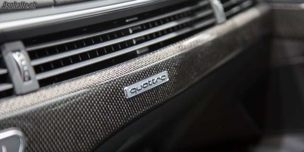 La surprise vient de la transmission: la S4 B9 est équipée d’une boîte tiptronic à convertisseur de couple et 8 rapports en remplacement de la S-Tronic à 7 rapports qui équipait les S4 B8. Cette boîte intègre un mode de roule libre lorsque le conducteur relâche la pédale de gaz entre 55 et 160 km/h. Le système Quattro avec différentiel central Torsen fait partie de la dotation de série avec une répartition par défaut de 40/60, modulée de 70/30 à 15/85 selon les conditions d’adhérence. La caisse est abaissée de 23 mm par rapport à l’A4, et une suspension variable est offerte en option. La nouvelle S4 est livrée de série en monte 245/40R18, avec des jantes de 19 pouces en option. Par rapport à sa devancière, les dimensions des A4/S4 B9 sont en légère augmentation: 4726 mm de longueur sur un empattement de 2820 mm (+12mm) pour la berline, 1842 mm (+16mm) de largeur et 1427 mm de hauteur, la plus faible du segment. Le poids du break S4 Avant est annoncé à 1675kg. La capacité de son coffre est modulable entre 505 et 1510 litres.