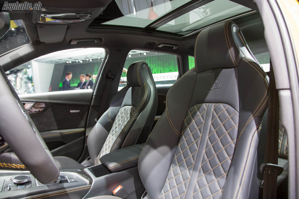 A l’intérieur, le Audi Virtual Cockpit est proposé en option, comme sur l’A4. Le système reprend l’écran LCD de 12.3″ et 1440×540 pixels de résolution commercialisé pour la première fois sur le TT de 3ème génération. Deux modes de visualisations sont accessibles par le bouton View situé sur le volant, l’une classique avec des instruments de taille normale, l’autre utilisant la majorité de l’espace d’affichage pour la carte de navigation, le répertoire téléphonique, les contenus audio ou la radio. L’Audi Virtual Cockpit peut également afficher l’interface de services en ligne. Le système MMI est disponible en deux exécutions: un écran de 7″ et résolution de 800×400 pixels pour le système MMI de base, et 8.3″ avec une résolution de 1024×480 pixels pour MMI Navigation Plus. Les tablettes Android optionnelles de 10.1″ vues sur le SUV Q7 seront disponibles en option sur la S4 peu après le lancement. L’interface smartphone supporte à la fois Apple Car Play et Android Auto. L’application pour smartphones MMI connect permet de multiples passerelles, notamment le transfert de destinations Google Maps, des services de streaming audio ou radio internet. La connectivité LTE/UMTS et un hotspot WiFi font partie des équipements optionnels. Côté systèmes d’assistance, on note l’apparition d’un nouveau régulateur de vitesse adaptatif avec fonction Stop & Go est capable de freiner la voiture jusqu’à l’arrêt, puis de conduire la voiture de manière autonome jusqu’à 65 km/h, direction y comprise.