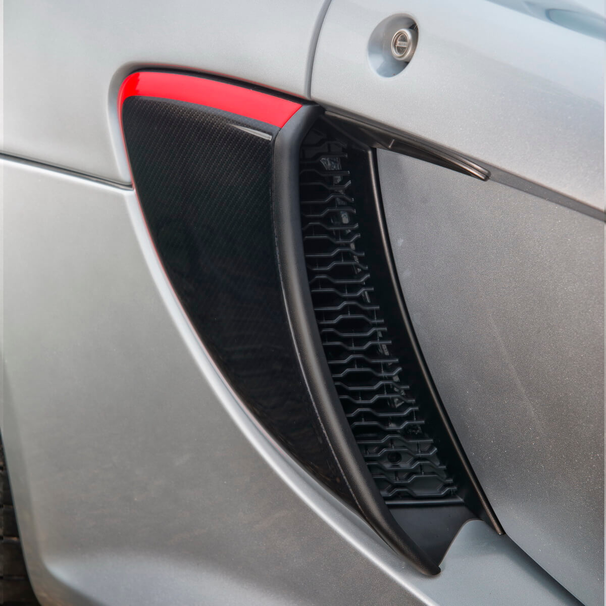 Comme de coutume chez Lotus, la lutte contre l’embonpoint est une préoccupation obsessionnelle. Le splitter avant, le panneau d’accès avant, l’aileron arrière et l’encadrement du diffuseur arrière ont tous été revus, économisant à eux seuls 2,7 kg. La nouvelle lunette arrière ultra-légère en polycarbonate transparent pèse 0,9 kg de moins que celle de l’Exige Sport 350. Les sièges sport carbone (- 6 kg), la batterie lithium-ion (- 10,3 kg), les roues forgées ultra-légères et les disques de frein rainurés en deux parties (- 10 kg) s’additionnent pour un gain de poids total de 26,3 kg. Le poids à vide est annoncé à 1110 kg, ce qui se traduit dans un rapport poids/puissance coquet de 2.92 kg/ch. Le réservoir ne fait par contre que 48 litres, ce qui limitera le nombre de tours qu’on peut enquiller sur circuit avant pit stop.