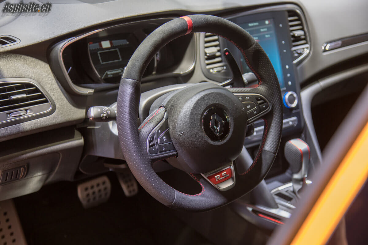 La nouvelle Megane R.S. est dotée du système 4CONTROL à quatre roues directrices, une première mondiale sur le segment, destinée à améliorer l’agilité. Le système se combine à deux spécifications de châssis, Sport et Cup. Renault propose des roues de 18 ou 19 pouces en option (monte 245/35R19). Les voies sont élargies, tout comme les ailes, et la nouvelle Megane RS se passe des élargisseurs disagracieux de la version précédente. La livrée de lancement se dénomme Orange Tonic. On remarque la présence d’écopes sur les ailes avant, et d’une sortie d’échappement centrale intégrée au diffuseur.