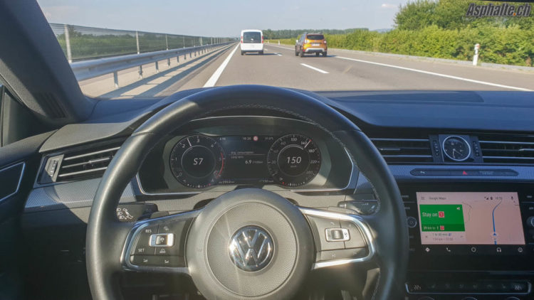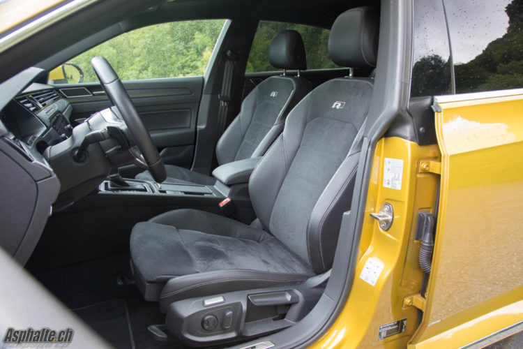 La question mérite d’être posée car l’Arteon m’a surpris – positivement – par un comportement routier rigoureux. Le train avant encaisse sans broncher les épingles lentes passées en force tout comme les plus gros appuis. Dans le premier cas, l’Arteon conserve une ligne serrée malgré l’arrivée du couple. Dans le second, le châssis contient efficacement les mouvements de caisse et la précision de l’ensemble met en confiance. Ces bonnes dispositions me font d’autant plus regretter le maintien déficient des sièges d’origine (des sièges ergoComfort sont disponibles en option pour CHF 1’340 et remédient peut-être au problème) et les sensations moteur ternes.