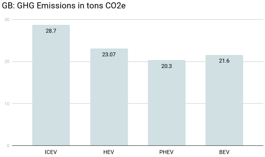 The british study concludes that, in a typical scenario for 2020, an electric car will have a lifetime footprint of 21.6 tons of CO2, 6% higher than a PHEV (Plugin Hybrid Electric Vehicle) but 12% lower than a HEV (non rechargeable hybrid car). Total emissions for the electric car are 24.7% lower than its equivalent with an internal combustion engine.