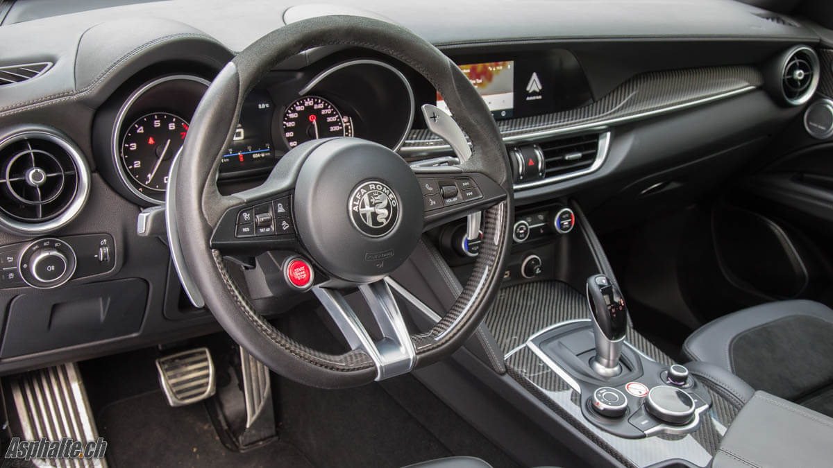 Habillé du très électrique bleu misano, un changement bienvenu du sempiternel rouge Alfa. L’appréciation des lignes et volumes est une affaire de goût, mais le Stelvio Quadrifoglio a une présence visuelle indéniable. A l’intérieur, le dessin et l’agencement rappellent fortement la Giulia. L’impression qualitative initiale est très bonne. De beaux inserts en carbone, une sellerie de qualité, de sculpturales palettes de sélection en aluminium avec un feeling très “Ferrari-esque” forment un ensemble qui flatte la rétine et le bout des doigts.