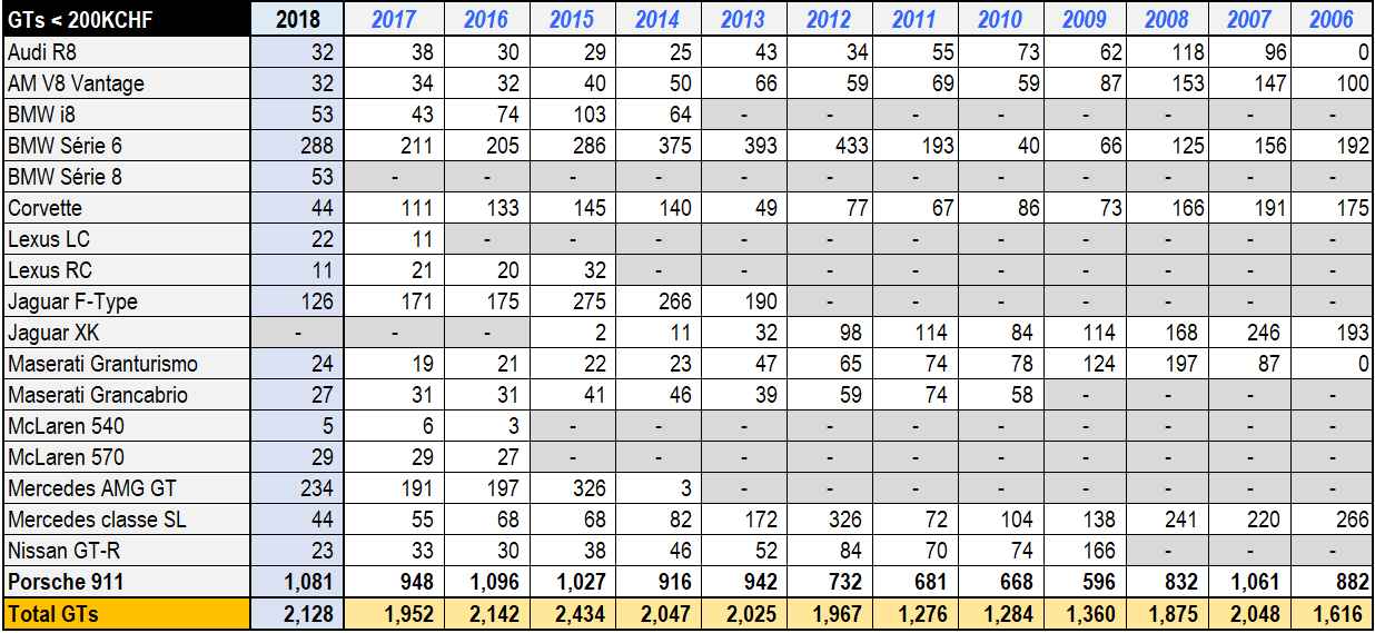 Parmi les GTs un peu plus abordables, la Porsche 911 continue à dominer, démentant les craintes que la suralimentation allait trop dénaturer la Carrera. Les livraisons de Corvette ont plongé, celles de Nissan GT-R sont devenues confidentielles. L’AMG GT se maintient à un excellent niveau, tout comme la SLS avant elle.