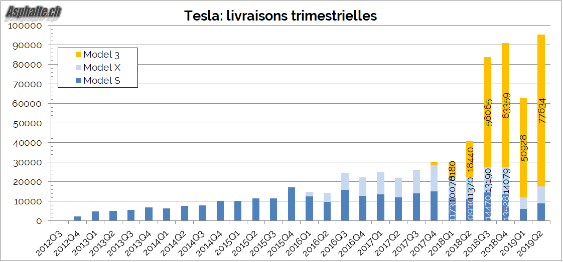 Tesla a annoncé le 2 Juillet 2019 avoir livré 95’200 voitures au deuxième trimestre 2019, un record pour la marque. Une fois finalisé, ce volume se répartit en 77’634 Model 3 et 17’722 Model S & X.
