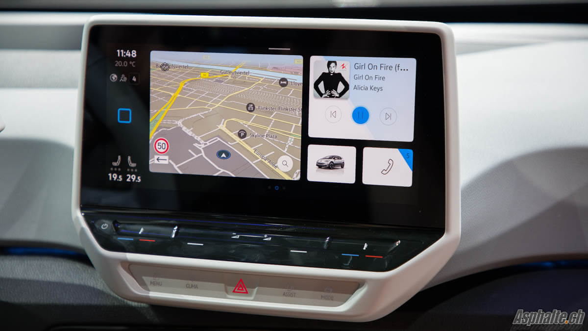 Au niveau des équipements, l’ID.3 propose un affichage tête haute avec des fonctions de réalité augmentée. En plus des informations habituelles de vitesse, navigation et multimedia, l’écran projette beaucoup plus haut dans le champ de vision des indications flèchées sur les directions à prendre.